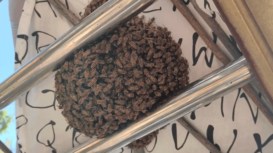 广东一女子在天台晒枕头,结果枕头下聚了密密麻麻一窝蜜蜂,养蜂人:是蜜蜂在分家